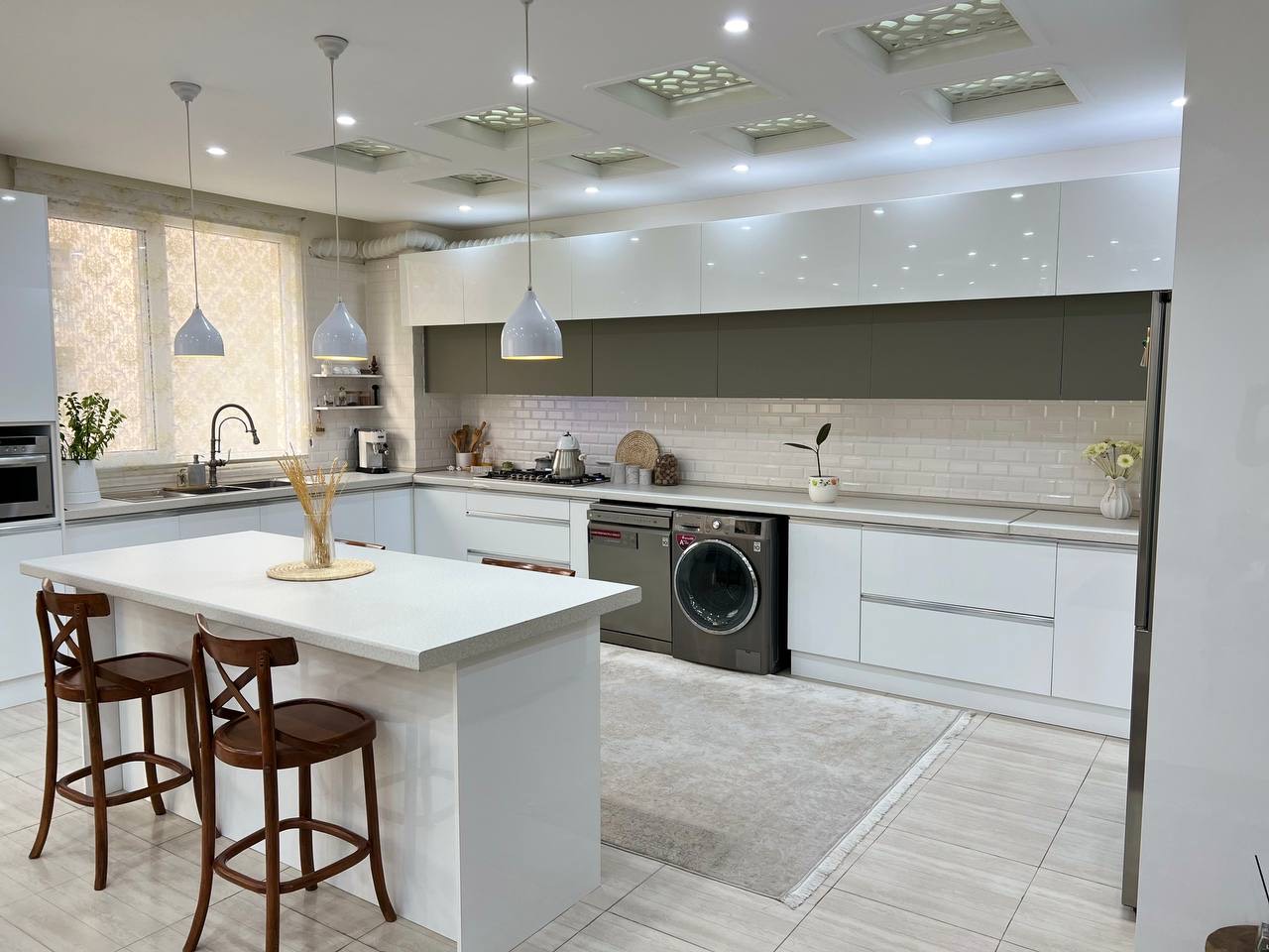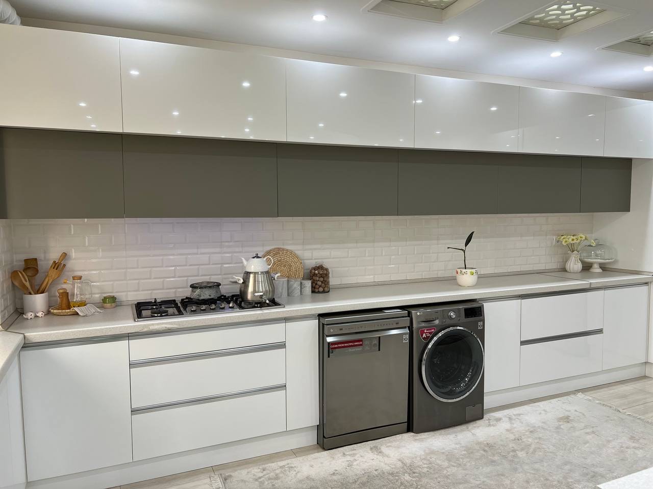 A full kitchen installation featuring sleek handleless units, marble-effect worktops, integrated appliances, and a clean, modern layout. Designed and fitted to create a bright, practical, and elegant kitchen space.