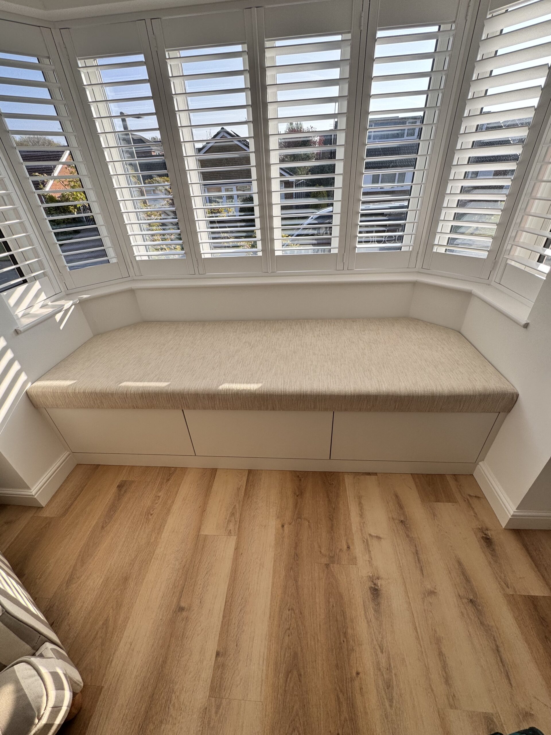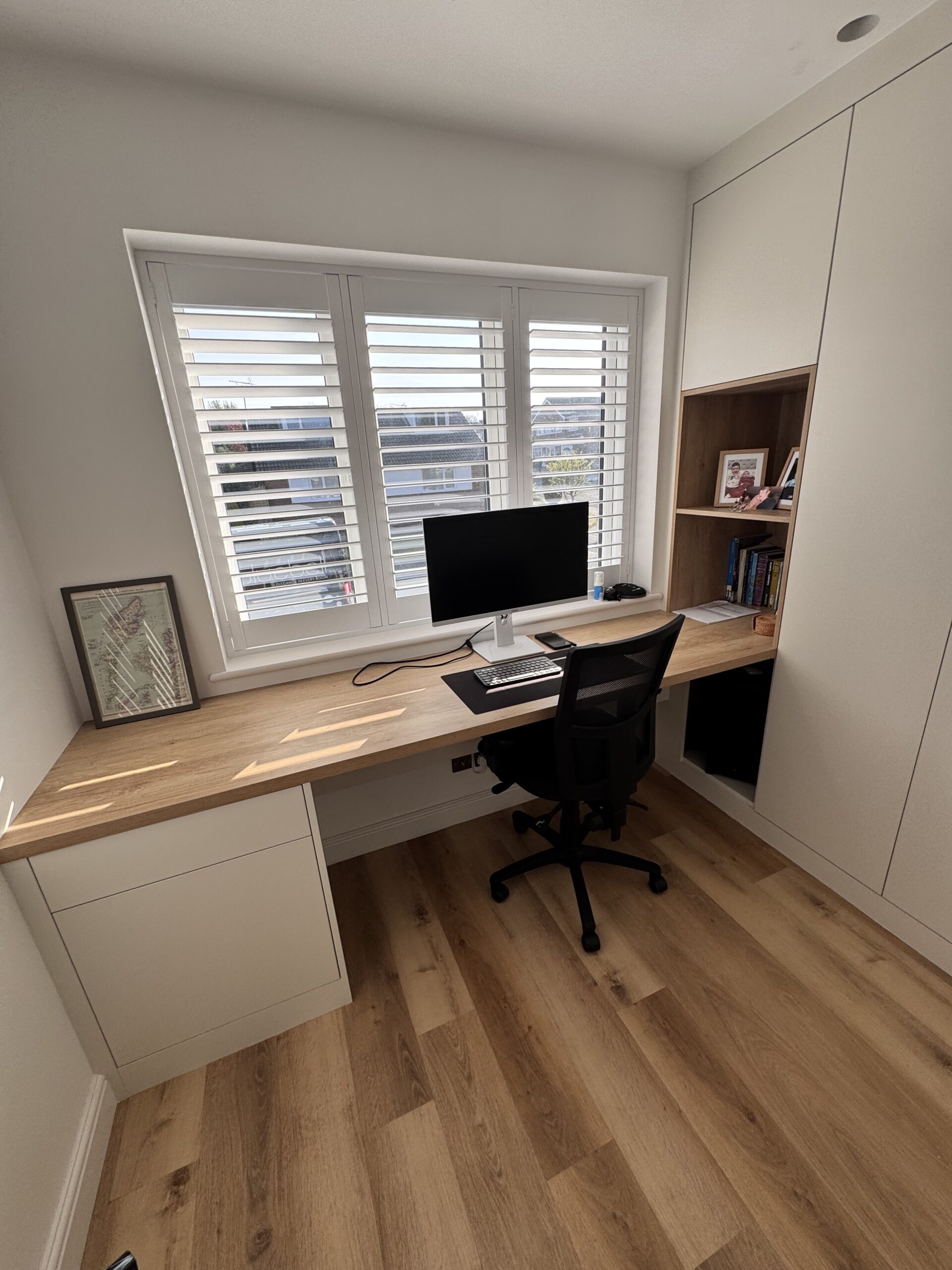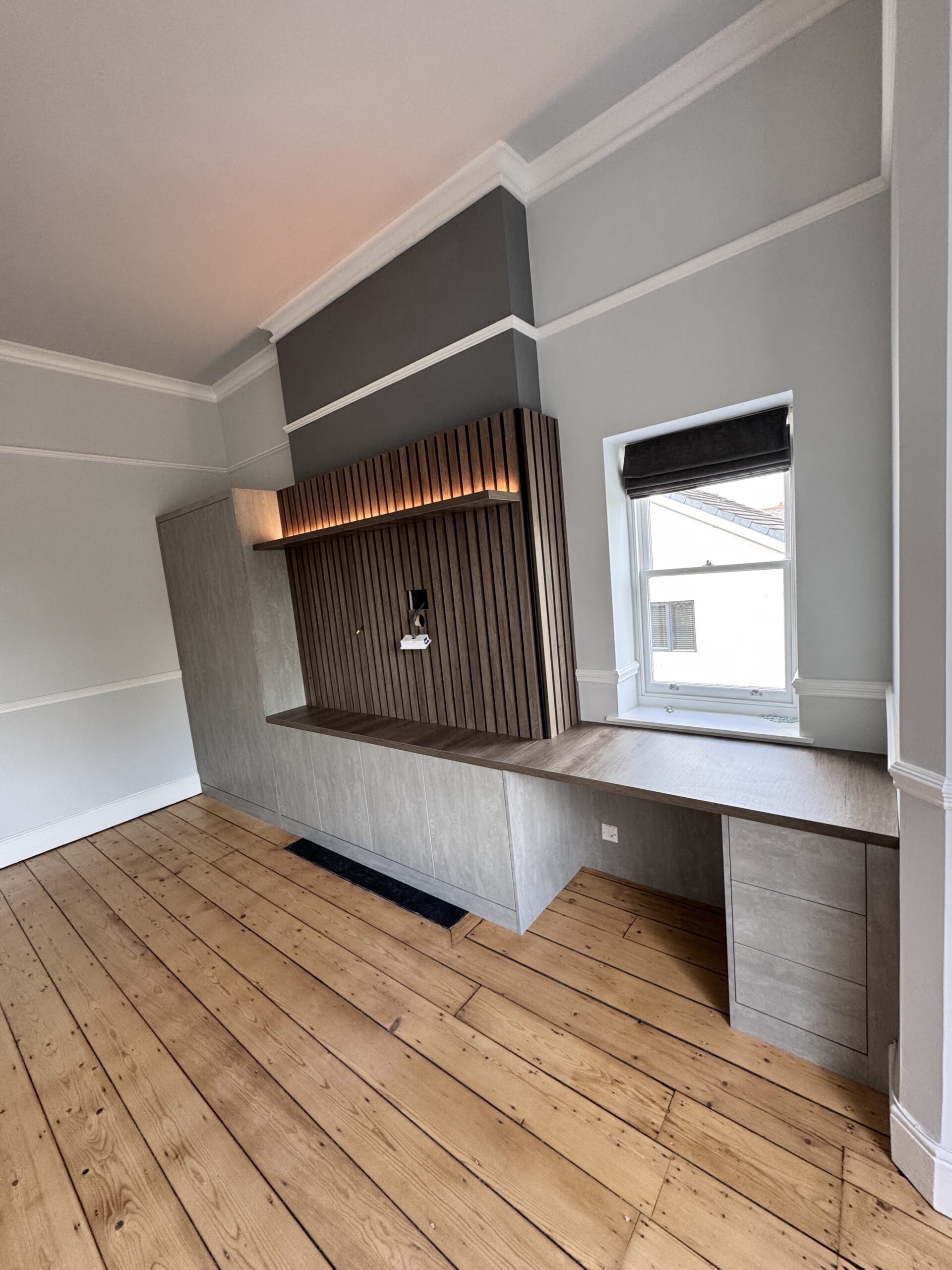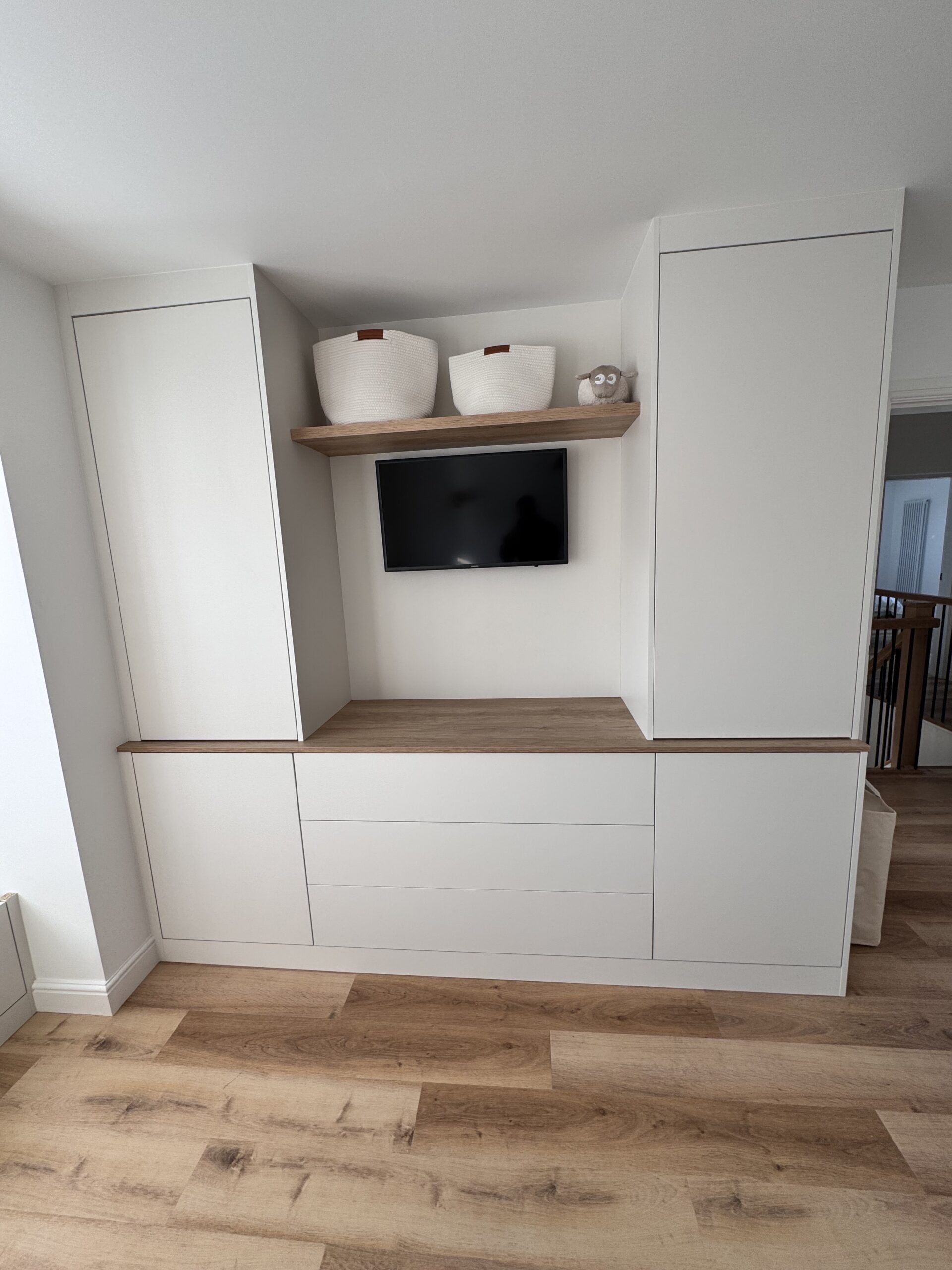 A custom-built media wall featuring integrated shelving, concealed LED lighting, and a recessed TV area. Designed and installed to create a clean, elegant focal point with practical storage and soft ambient lighting.